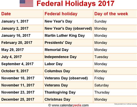 Federal holidays are public holidays established for. Year 2017 calendar with week numbers and us holidays. See a list of the 2017 holidays how many days till then and what weekday they occur on. 138 rows united states 2017 holiday calendar with all major holidays and observances. 2017 calendar with holidays and celebrations of the united states. Us holidays, week number, date picker, days past calculator, date to date picker and copy date to clipboard