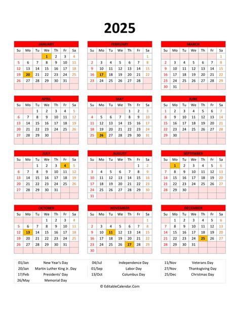 Stay organized with our 2025 calendar with us holidays. Stay organized, track your schedule, and make the most of every day with the yearly calendar 2025 editable in excel, word, or pdf formats. The template is customizable using our online excel calendar creator. You can also choose portrait or landscape orientation before printing.