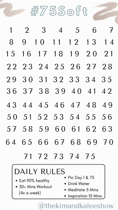 This 75 soft printable calendar will help you track how far into the challenge you are each day. Download our brand new 75 soft printable tracker for free and stay on top of your fitness goals. Ready to transform your health in 75 days? It includes the rules, a 75 day countdown, food log, body measurement trackers. No alcohol or cheat meals allowed. Wondering if you should do the 75 soft challenge?