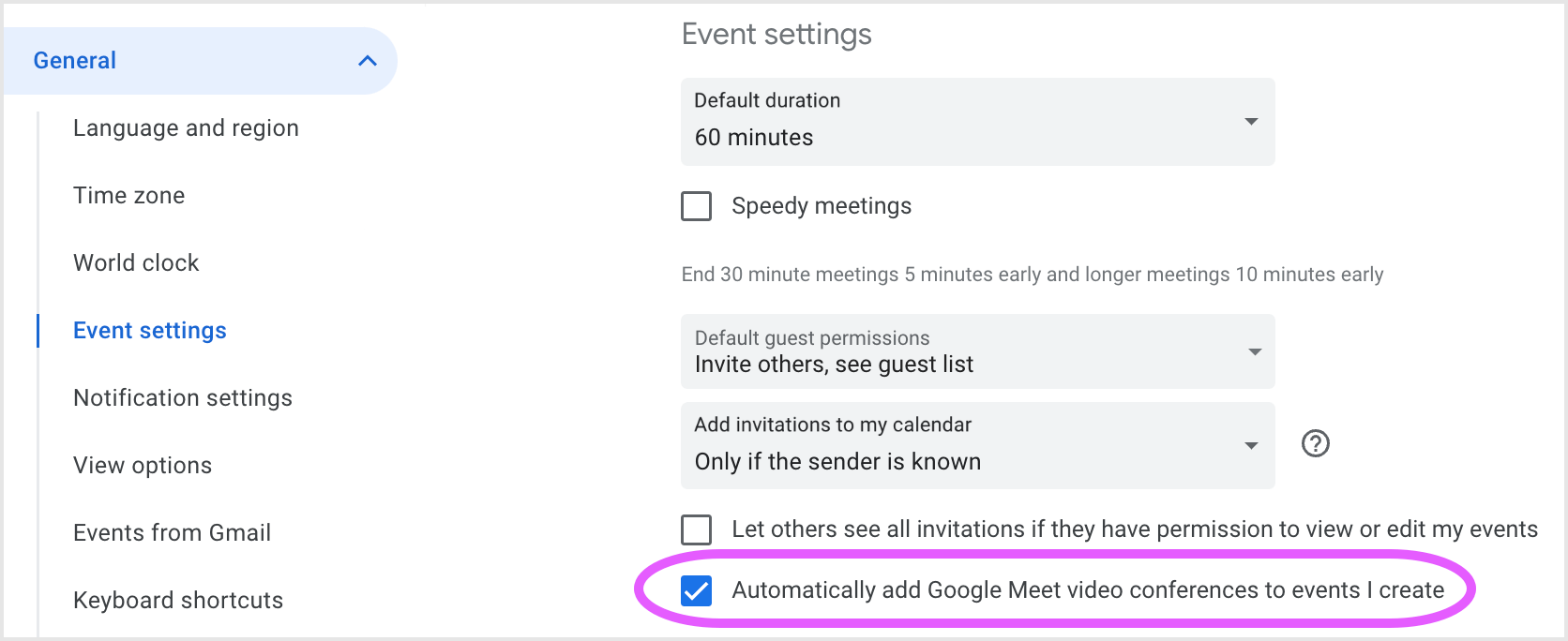 The public instance of google calendar has a setting to automatically add google meet to events you create (under settings > general > event settings): Invitations from everyone —all events appear on user calendars. Choose an option to determine which events get added automatically: In just a few steps, you can schedule google meet video conferences and automatically add them to your calendar events.