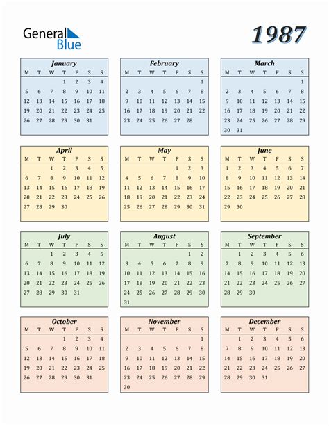 Yearly calendar showing months for the year 1987. Download printable august 1987 calendar. August 1987 calendar with holidays and celebrations of the united states. The available file formats are pdf (adobe reader pdf) and jpg (figure).
