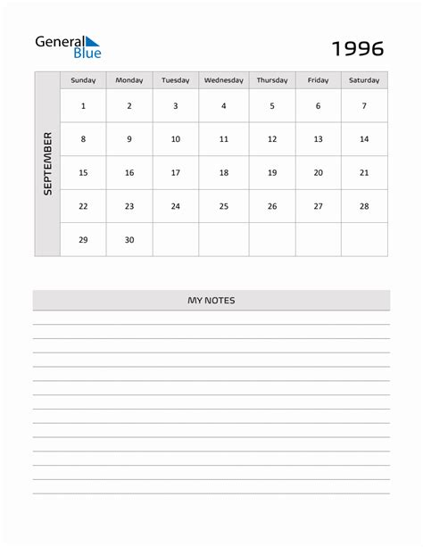 Calendar Of September 1996 - You can create online monthly calendar september 1996 with holidays. Bhadra and asvina are the lunar months corresponding to. This printable monthly calendar list all the days of. Blank september calendar and september holidays 1996 are. Doesn't get easier than that. September 1996 calendar created date:. Download free printable september 1996 calendar templates with holidays in.pdf format.