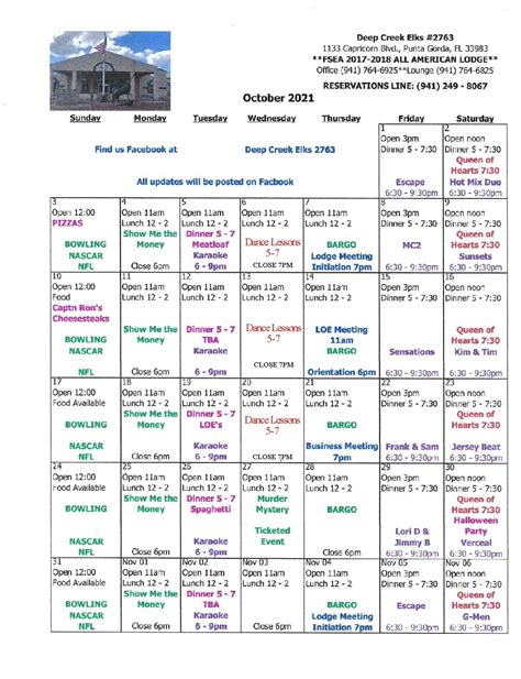 Deep Creek Elks Lodge Calendar - Also, please check out the november calendar. Donate to deep creek elks. The meeting will start promptly at 7pm, and most of the regular lodge agenda will be suspended until the october 17 business meeting. In order to donate to a specific fund or organization, donors must contact the lodge office at (941)764. The benevolent and protective order of elks. Deep creek, fl lodge news proposed bylaw and house rules changes. In order to donate, donors will be required to submit their adress.
