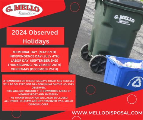 G Mello Calendar - Click here to view our subscription pick up calendar. Recyclables are picked up every other week. Abor day, thanksgiving and memo. Items can be brought to g. Trash is collected once a week. Below is a local guide to help you dispose of hard to get rid of items. You can also bring any bulk items, including construction debris to a transfer station such as g.