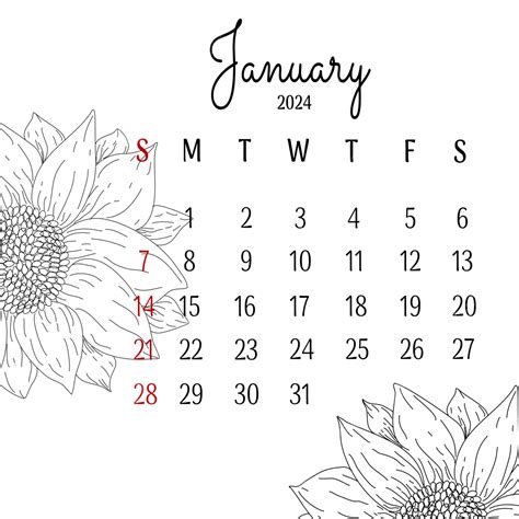 Calendar January 2024 With Aesthetic Flowers Vector, January 2024