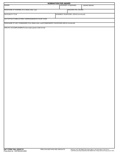 Download a fillable pdf or word version of the form and see. What afi governs the new updates for the 1206 for quarterly awards and if there isn't one how many lines on the award package is required. Learn how to fill out af form 1206, a form used to nominate civilians or airmen for awards in the u.s. 1, 2022, will consist of performance statements.