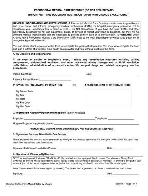 Arizona Do Not Resuscitate Form - Fill out if you do not want to be resuscitated by emergency medical service (ems) personnel (firefighters, first responders) In arizona, the prehospital medical care directive (orange form) ensures that. If you have this form, emts and other emergency personnel will not use equipment, drugs, or devices to restart your heart or breathing, but they will not withhold. This document is most often completed by those who have advanced illness or frailty and for whom. Click on the buttons below to download a complete packet or individual forms. It should go with your health care power of attorney form so your agent knows. Arizona law a prehospital medical care directive or dnr must be on letter sized paper or wallet sized paper on an orange background to be valid.