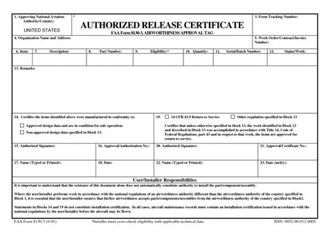 It can also be used for the purpose of exporting engines, propellers or other aviation articles. 14 cfr 43.9 return to service other regulation specified in block 12 federal regulations, part 43 and in respect to that work, the items are approved for 13d. Certifies the items identified above were manufactured in conformity to: Contact your appropriate civil aviation authority (caa).