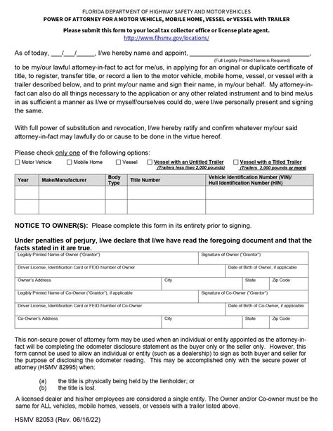 However, this form cannot be used to allow an individual or entity (such as a dealership) to sign as both buyer and seller for the purpose of disclosing the odometer reading. Graves, chief of the bureau of motorist compliance of the florida department of highway. Power of attorney on this _____ day of , 20_____, i hereby name and appoint william r. A florida motor vehicle power of attorney (form hsmv 82053) is a document used to accommodate the needs of motor vehicle owners who cannot (or do not wish to) handle their.