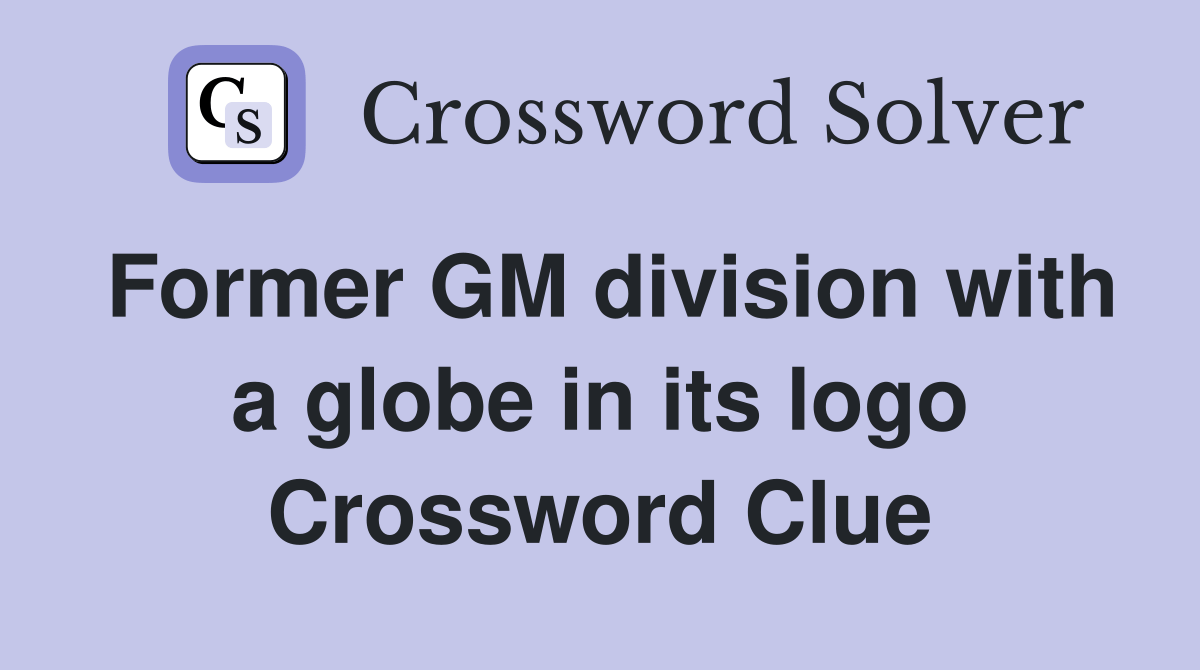 Did you find the solution of former gm division with a globe in its logo crossword clue?. Here are the possible solutions for former general motors division with a globe in its logo clue. Find answers for the crossword clue: How can i find a solution for former gm division with a globe in its logo?