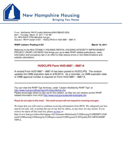 Your failure to sign the consent form may result in the denial of eligibility or termination of assisted housing benefits, or both. Ensure that all tenant data submissions comply with hotma regulations. When can i start implementing the new hotma compliant tenant consent form (hud 9887/9887a)? Failure to sign consent form: