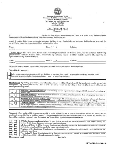 You can download the advanced directives forms and information about these directives from this site. Filling out a tennessee living will form is an important step for residents to ensure their health care preferences are known and respected. It is a legal document in the state of tennessee. A tennessee living will is often referred to as an advance care plan or an advance directive form.