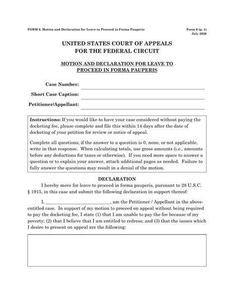 §1746 ) in the form prescribed by the federal rules of appellate procedure, form 4. The motion must include a copy of the affidavit filed in the district court and the district court’s statement of reasons for its action. A party seeking to proceed in forma pauperis shall file a motion for leave to do so, together with the party’s notarized affidavit or declaration (in compliance with 28 u.s.c. Be sure to read the following rules carefully: Once a party has been permitted to proceed in the trial court in forma pauperis, they may proceed on appeal without any further authorization.