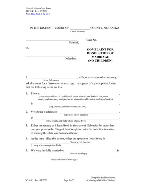This ofice has been registering dissolutions of marriage (divorces) occurring in nebraska since 1909. Get a free printable ne legal forms in pdf or prepare papers online. The forms on this page are a product of the lancaster county district court and are provided as a public service to people who are proceeding on their divorce cases pro se. Complaint for dissolution of marriage (no children) i, ___________________________________ , without assistance of an attorney, (your full. This nebraska complaint for dissolution of marriage (children) form is classified as a divorce filing form.