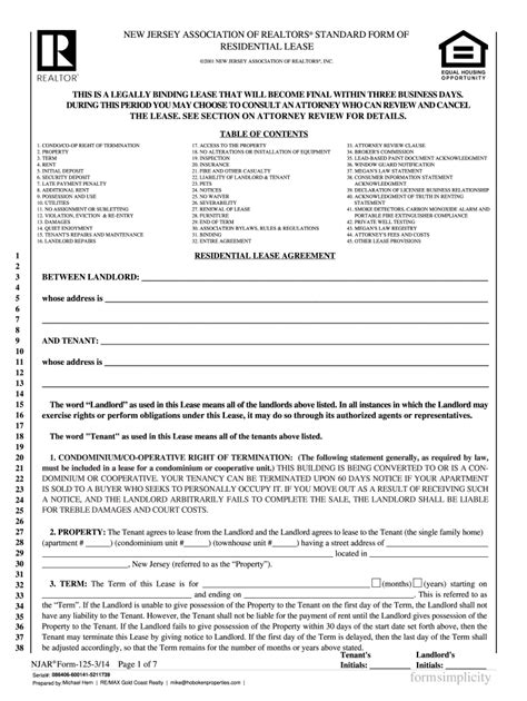 Download an official new jersey residential lease agreement template. New jersey real tors® lease rider regarding steam radiator notice. This lease rider regarding steam radiator notice, which. The njar 125 7 12 form is a comprehensive standard form of residential lease created by the new jersey association of realtors®.