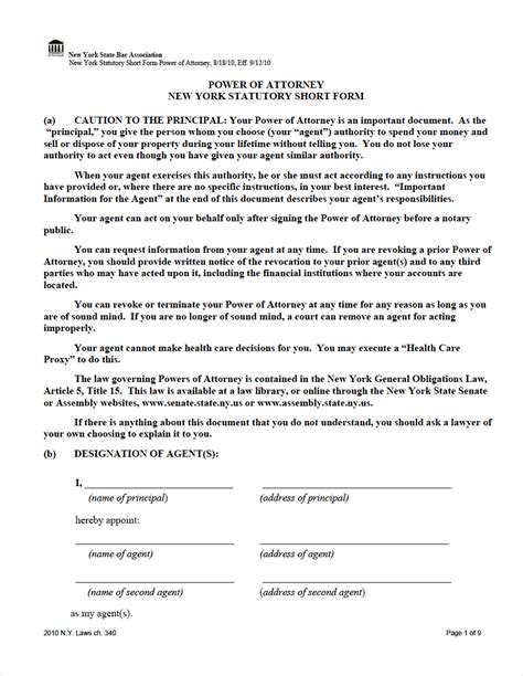This law is available at a law library, or online through the new york state senate or assembly websites, www.senate.state.ny.us or www.assembly.state.ny.us. General durable power of attorney new york statutory short form (a) caution to the principal: The law governing powers of attorney is contained in the new york general obligations law, article 5, title 15.