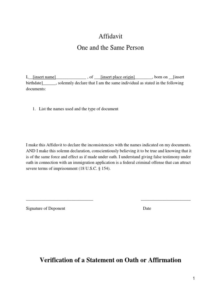 The person completing the ‘one and the same’ affidavit bears legal and financial responsibility should the facts in the. Changes may not be made to this form once it is signed and witnessed. Print and complete the form you need, then return it to the address noted on the form. The two different names found on different documents refer to one person.