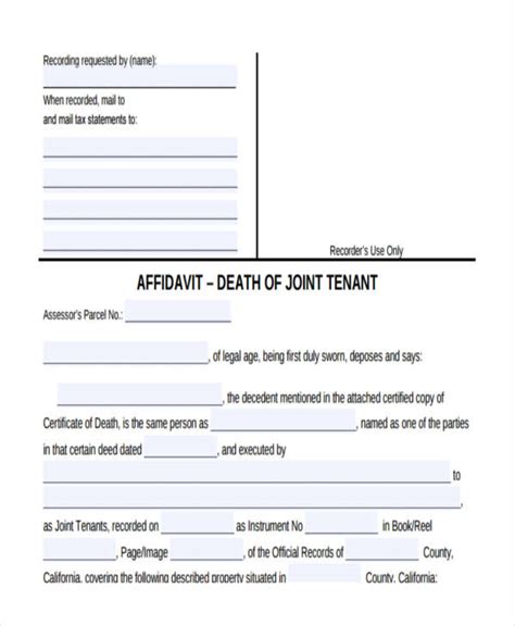 Take a certified copy of the death certificate of the deceased joint tenant and your affidavit to the recorder's office in the county where the real property is located. A notary public or other officer completing this certificate verifies only the identity of the individual who signed the document to which this certificate is attached, and not the truthfulness,. Consult a lawyer if you doubt the form’s fitness for. A standard document for an affidavit of death used in california to transfer title to the surviving owner after the death of a joint tenant. Parents sometimes add children as joint tenants so that their property goes to them without probate after the parent dies.
