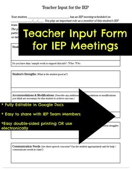 The information you provide will assist the special. A report form for general education teachers to complete and submit before an iep meeting. Teachers are able to provide input for student strengths and weaknesses, student performance, student behavior, and teacher adaptations. Today we’re going to talk about the different types of input and why it is important to. Have you ever wondered why parent, student, teacher input is so important when writing iep forms?
