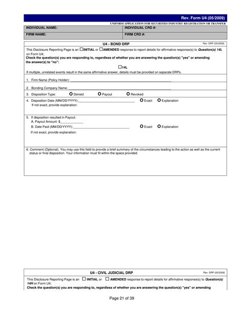 This disclosure reporting page is an initial or amended response to report details for affirmative response(s to question(s) 14a and 14b on form u4; By filing a form u4, a registered person agrees to provide true and complete answers to the questions. Learn how to amend a form u4 filing to complete the rsl question by watching this short (2:04 minutes) video. What is a form u4? On form u4, an applicant must answer questions about personal data, including residential and business history.