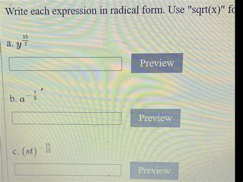 Click the blue arrow to submit. Convert to radical form 7^ (1/2) 71 2 7 1 2. Write each expression in radical form. When the exponent of an expression is a fraction, we can evaluate/simplify the expression by convertin. = m3 ⋅ (1/5) power 1/5 can be.