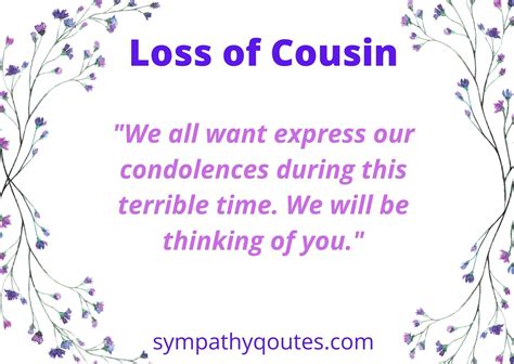 Write sympathy messages for loss of cousin to your friend or acquaintance with the newest collection of condolence text messages and sympathy card messages to share. My heartfelt condolences on the loss of your cousin. As southerners, we know mailing a card with a condolence message, sending flowers with a sympathy quote, or bringing a covered dish are good ways to express your support. You want to make sure you properly say sorry for your loss but in a respectful and heartfelt way.