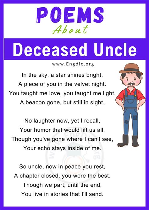 It can be difficult to know what to say to a niece or nephew that has just lost an uncle. To make it easy to find the sentiment that you are. Poems, tributes and rip messages for the death of an uncle, funeral poems for uncles. We have assembled a collection of 40+ most beautiful funeral poems for uncle to help you celebrate his life and his enduring love.