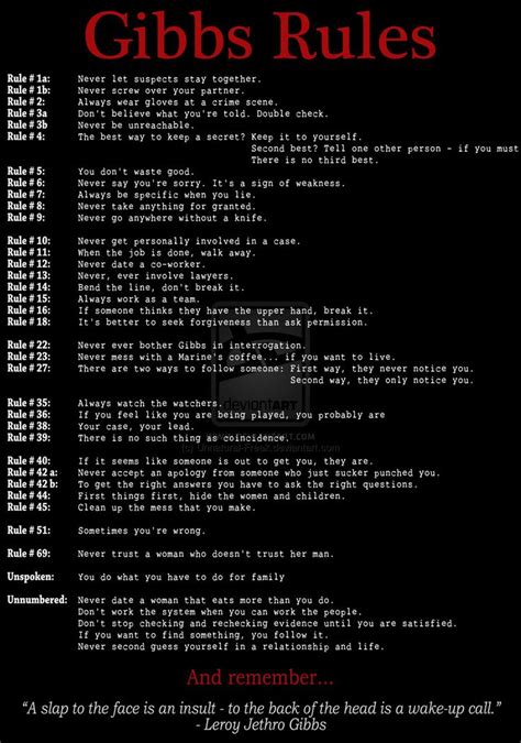 Here are the rules that have been revealed so far:. The document outlines over 50 rules that gibbs lives by as an ncis agent. Always wear gloves at a crime scene. Mark harmon played the character for nearly two decades on the series, using. Leroy jethro gibbs has rules that he enforces with everyone on his team, in 3x05 switch he told ziva that there are approximately fifty rules.