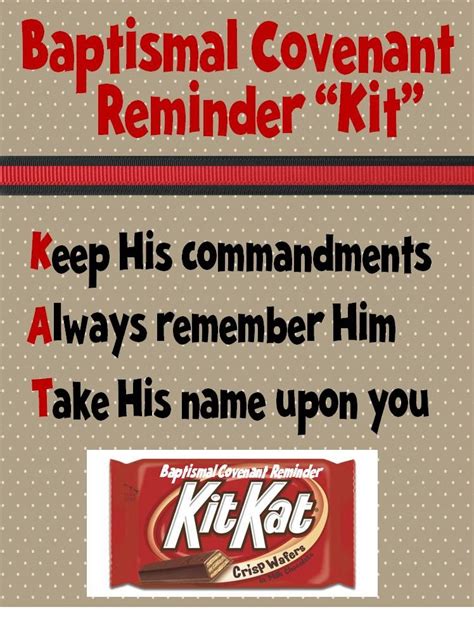 These signs can be used during the talk as visual. The kit you need to remember the baptismal convenants is all in the name of this chocolate bar! I found this cute idea for a kit kat wrapper here on sugardoodle and instantly loved it! This kit kat object lesson can be used for a baptismal talk, for primary (come follow me) or for a family home evening lesson on baptism. Baptism is the first ordinance of the gospel.