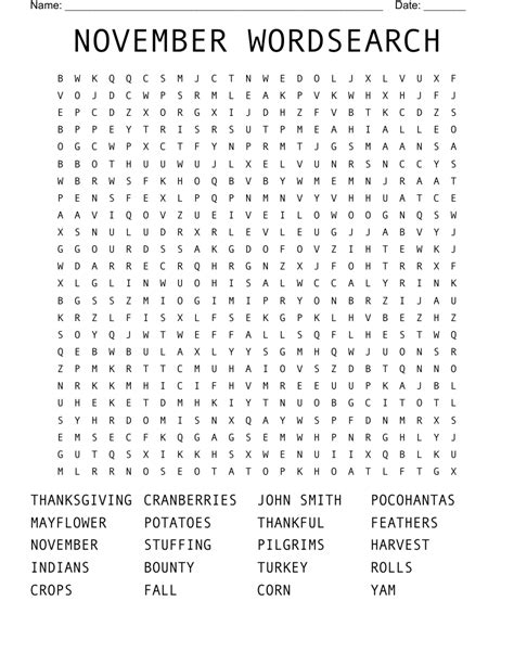 November Word Search Printable