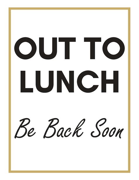 In our collection of information signs you can find out to lunch signs, quiet please signs or out of order signs to use on faulty machinery, for example. Or, download the editable full pack of 13 signs. Start your day right with our delicious breakfast, enjoy a hearty lunch with our signature sandwiches and wraps, or order a platter for your next event! Printable out to lunch sign | free download.