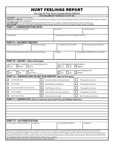 Need a printable hurt feelings report form? To assist whiners in documenting hurt feelings, and to provide fair and reasonable people with a list of whiners who require additional counselling, leadership dreams, and extra explanations. It includes satirical elements and can be. Data required by the privacy act of 1974 authority: