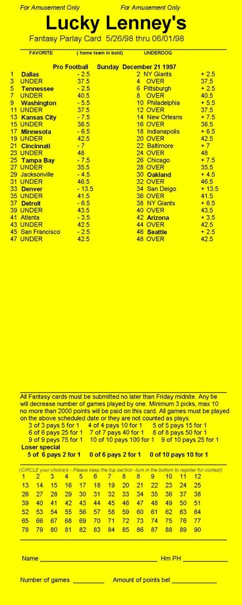 Printable Parlay Cards - Printable parlay cards offers the most comprehensive football parlay card service at the best value! Week 10 parlay cards were updated at 7:30 am mst on wednesday 11/6! 2 parlay cards per sheet. This is the last line update for the week. Purchase a season pass or weekly pass and you will be able to download up 30 different.pdf (or excel) versions of parlay cards (2, 3, and 4 cards per sheet…most are 8.5″x 11″ and some are 8.5″ x 14″). We offer 25 different parlay card formats every week (and 9 teaser card formats) Nfl pick 10 against the spread: