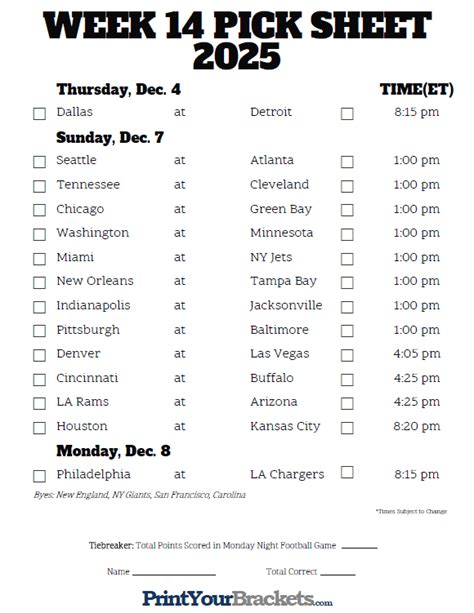 List of nfl weekly football games. Space to write in game projections and results. Nfl football week 14 picks and schedules. Print week 14 nfl pick'em office pool sheets in.pdf format. Week 14 pick sheet thursday, dec. Choose the winner of each game.