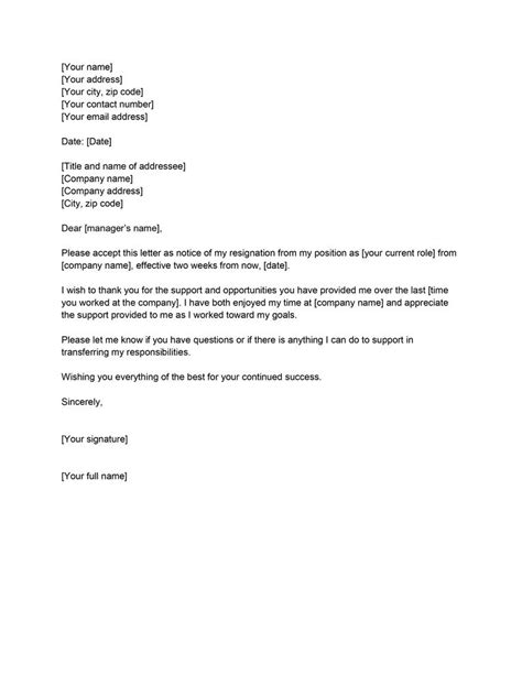 Download this two weeks' notice letter template in ms word format and start using it straight away. With our two weeks’ notice template, you can edit a resignation letter, sign it, and submit it to your current employer before starting your new job. What is a notice period? In this article we’ll look at what a letter of resignation is and how to write a two weeks notice. Basic two weeks notice template.