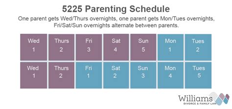 A 5225 parenting schedule is one in which one parent gets wednesday and thursday overnights, one parent gets monday and tuesday overnights, and friday, saturday, and sunday. A schedule for when the children will be with each parent; You can download one here. Templates offer a structured format for documenting.