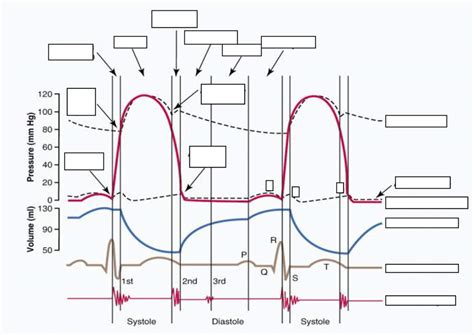 From top to bottom , the lines show: 1) aortic pressure, 2) ventricular pressure, 3) atrial pressure, 4) electrocardiogram, 5) mitral and aortic valve opening and Log in with your trainer account to access the material. This can be found under the training material tab. Systole can be broken down into the following stages: