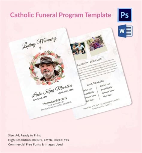 Choose from dozens of template examples and customize your choice online to follow the roman catholic funeral order of service or program. The details of location and that of the memorial service can be printed on this template. Our aim is to provide easy option to create, design & print the most important celebration of life programs. Collect details about the service and then customize the bulletin with personal elements. Add a statement guiding those attending to the printed ritual booklet so that they are able to follow the elements of the mass.