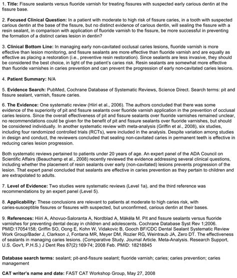 A cat is a standardized summary of research evidence organized around a clinical question, aimed at providing both a critique of the research and a statement of the clinical relevance of results. The cat process consists of the following steps: Critically appraised topics (cats) are very brief reviews which summarize current best evidence on an intervention or diagnosis. A critically appraised topic (cat) is a short summary of the best available evidence on a focused question. And appraisal of the body of evidence.