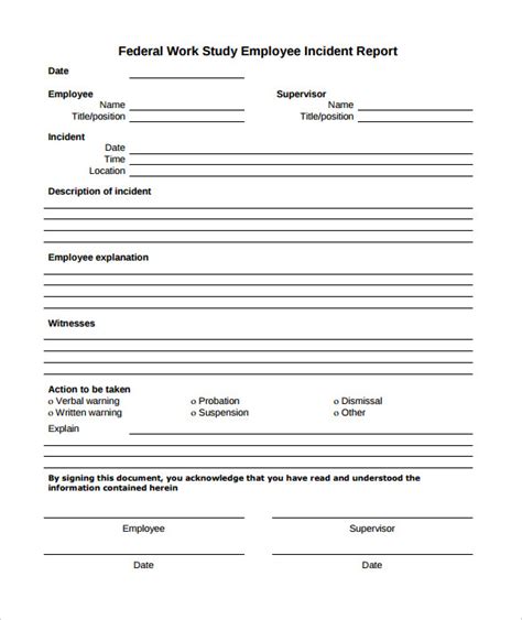 Record incidents and improve safety procedures with our free incident report templates that include near miss reporting and employee injury reporting form variations. An employee incident report is a report used to document an accident, injury, or another incident that occurs at work or at a workplace. An incident report is used to formally document an event that involves an accident, injury, property damage, or other unusual activity. You can download the template in microsoft word, pdf or excel spreadsheet formats.