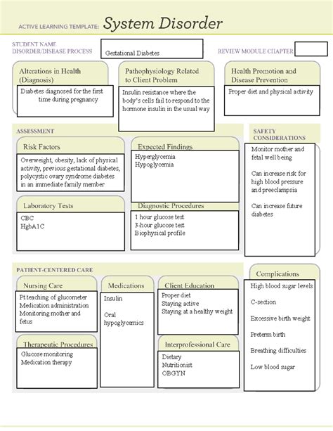 Gestational Diabetes System Disorder Template - Prescription of prenatal vitamins (with at least 400 μg of folic acid and 150 μg of potassium iodide [17]) is recommended prior to conception. System disorder active learning template: View ati template system disorder.pdf from nrse misc at east tennessee state university. Michaela maderas student name gestational diabetes. Students shared 44 documents in this course. This document has been uploaded by a student, just like you, who decided to remain anonymous. System disorder form ati template gestational diabetes.