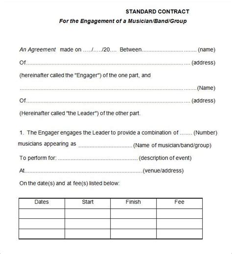 If you have to write contracts to secure musicians for an event, then you might want to use these templates to help you write them. Below you'll find a link to a template for a band agreement that will help you write your own agreement. Over 1,000 music companies, including established labels, publishers, music colleges, recording studios and. To be able to create a reliable and useful contract, you will need a music band contract template. Download our printable samples that your recording company can.