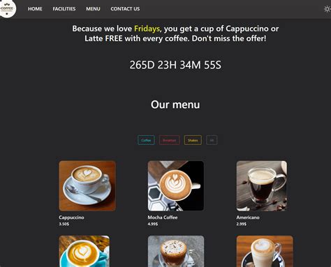 Blend sources locally roasted coffee for specialty and handcrafted coffee drinks along with wine and beer options. Blend sources locally roasted coffee for specialty and handcrafted coffee drinks along with wine and beer options. Static website coffee shop using next js + tailwind css + framer motion resources Next.js template with coffeescript 2 support. 1.3.0 rc — coming soon ⭐ next.js 15 ecommerce template i18n stripe shadcn tailwind drizzle zod trpc typescript clerk radix ui, responsive react 18 19 server components,. Users can order coffee as a guest or use their created account.