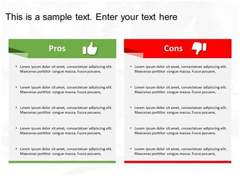 Use these pros and cons powerpoint slides to showcase informati. Free + easy to edit + professional + lots backgrounds. Editable graphics with text placeholders. Download our free pros & cons powerpoint template to make engaging presentations for discussing pros and cons of a topic. Consisting of 4 slides, the template offers quite a number of options for portraying pros and cons.