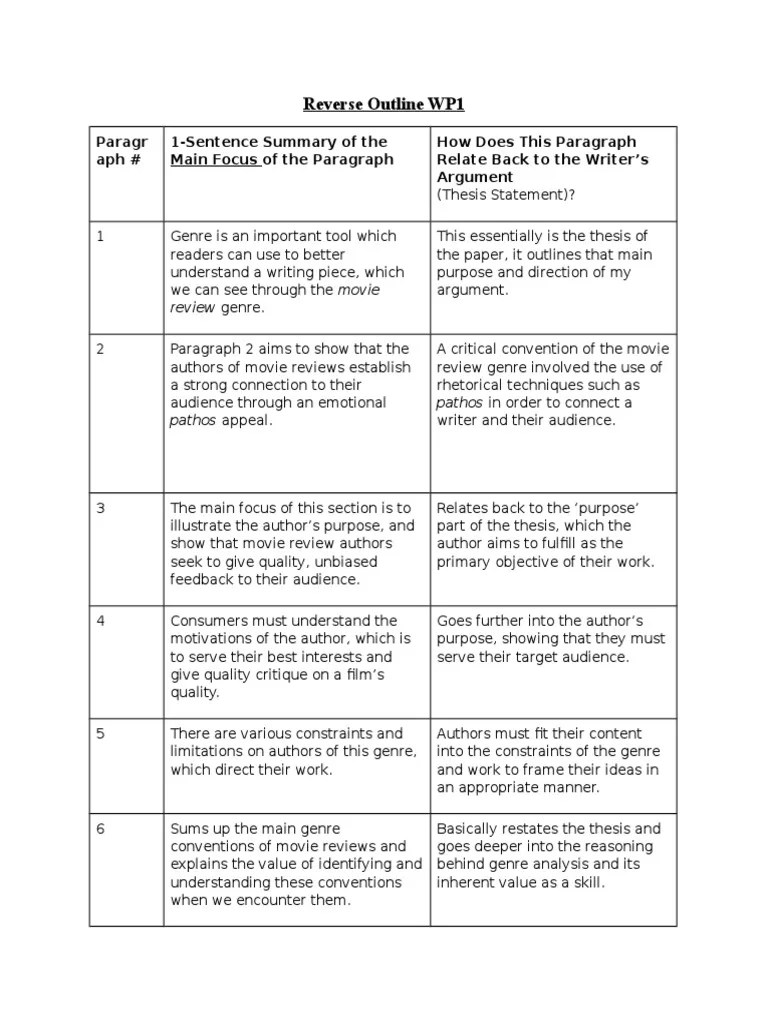 Download a reverse outline template and follow the steps to make. For every paragraph, write the main idea or main argument in a small number of words in the margin. We'll also discuss common mistakes writers make with their reverse outlines. Genre analysis involves looking at model texts to gain an understanding of how a particular document might be composed. The purpose of a reverse outline is to help you understand the structure of the paper you've already written.