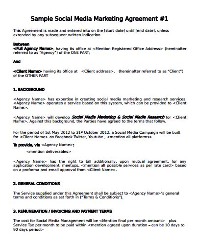 Social Media Contract Template - Compose social media marketing contracts with our free download samples available in pdf, doc, and other formats. Get your free, printable social media management contract template and take control of your online business today! Eliminate task confusion with this social media management contract template. Edit clauses and clearly lay out rules about payment, termination, and more. By using a social media marketing agreement, the parties can set forth the terms and conditions under which the marketer will assist the client in selling their goods or services by using popular social media platforms. This document clearly and concisely states the social media services that will be provided and also protects the rights and interests of all parties that are involved in the contract. Choose a template and create your contract easily.