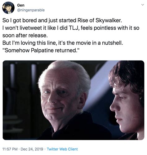 Browse the best of our 'somehow palpatine returned' video gallery and vote for your favorite! The old republic or better a book of revans story tell how he get so powerful and back then, the swtor story, also. I love episode vii and viii, but i thought episode ix really failed to explain palpatine's return, which wasn't a particularly creative idea to begin with. They saw that line as a wink to the audience confirming that they weren't going to get the explanation they felt was needed. Memes or upload your own images to make custom memes. Beyond a shadow of a doubt, the most popular meme from the rise of skywalker is poe's somehow, palpatine returned line.