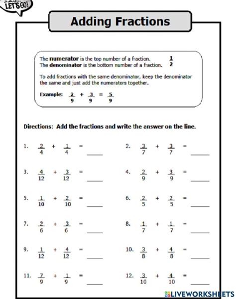 A useful worksheet for pupils to practice adding fractions with common denominators. Try our adding like fractions worksheets to find the sum of fractions with the same denominators and also master adding two fractions to make a whole. The corbettmaths textbook exercise on adding fractions with the same denominators Students add mixed numbers whose fractional parts have the same denominators.