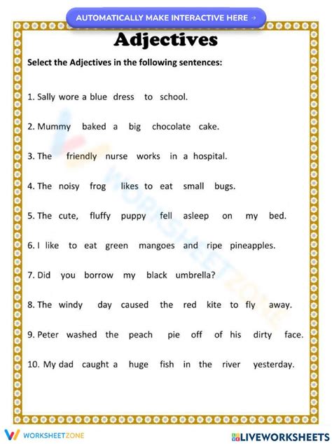 In these grammar worksheets, students identify the adjectives from a list of words. Free grammar and writing worksheets from k5 learning; K5 learning worksheets on filling the blanks in sentences with adjectives. Grade 2 grammar worksheets on adding adjectives to sentences.