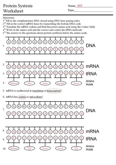 Use the dna code to create your mrna code. Every cell needs a copy of dna. Use your notes and book to answer the following questions concerning replication, transcription, and protein synthesis. Protein synthesis worksheet _____ directions: Use the dna code to create your mrna code.